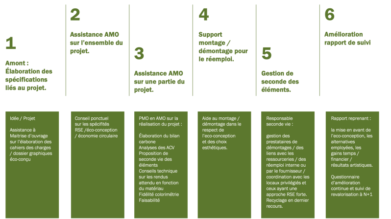Des conseils adaptés à vos projets d'exposition, signalétique de démarches RSE, présenté en 6 phases.
